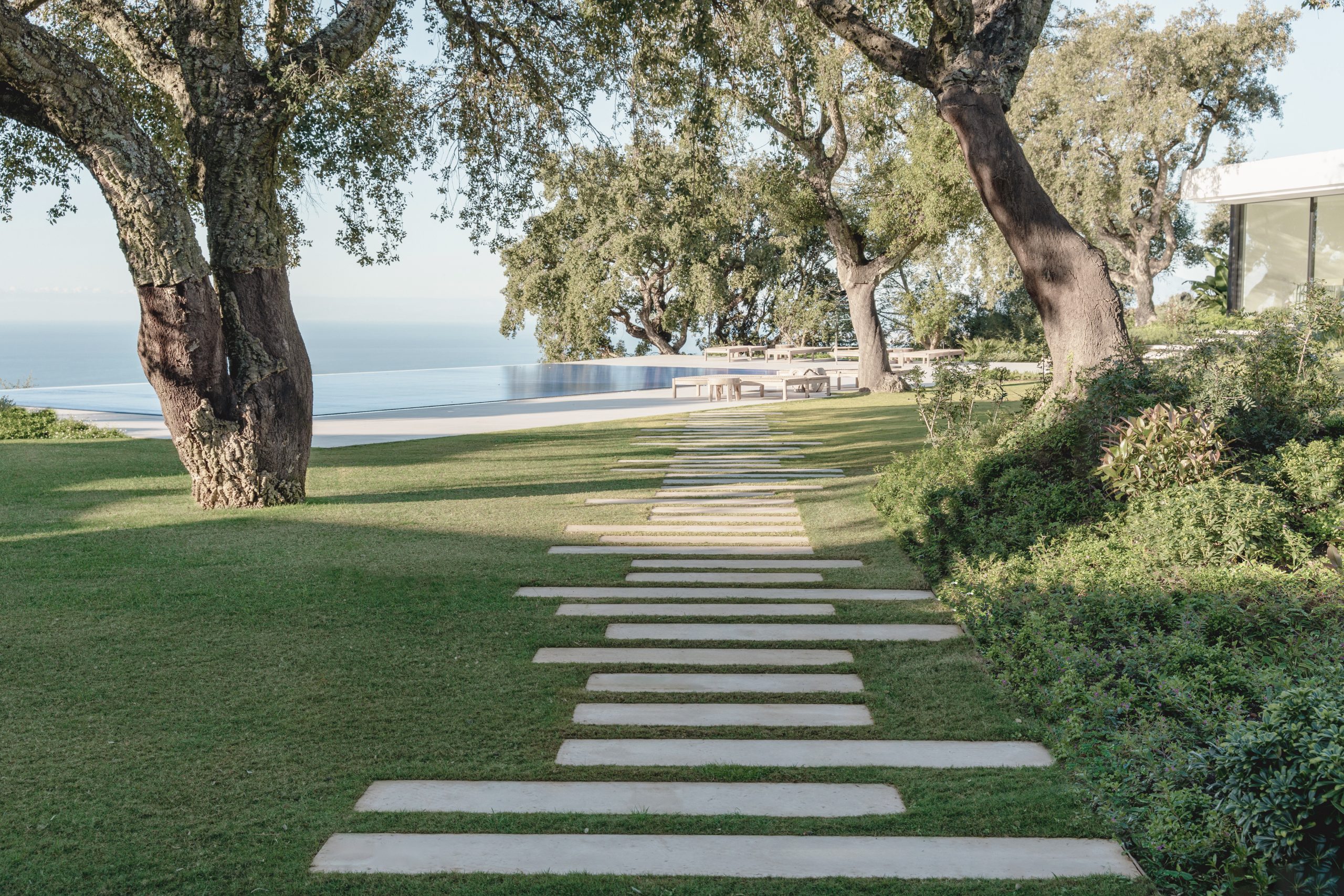 Lawns and tiled terraces help to create a clean space around pools and landscaped areas of this kind, and both olive trees, pines and cypresses are very effective in adding to the Mediterranean scenery surrounding you, while palm trees also help to add contrast for especially sea vistas.