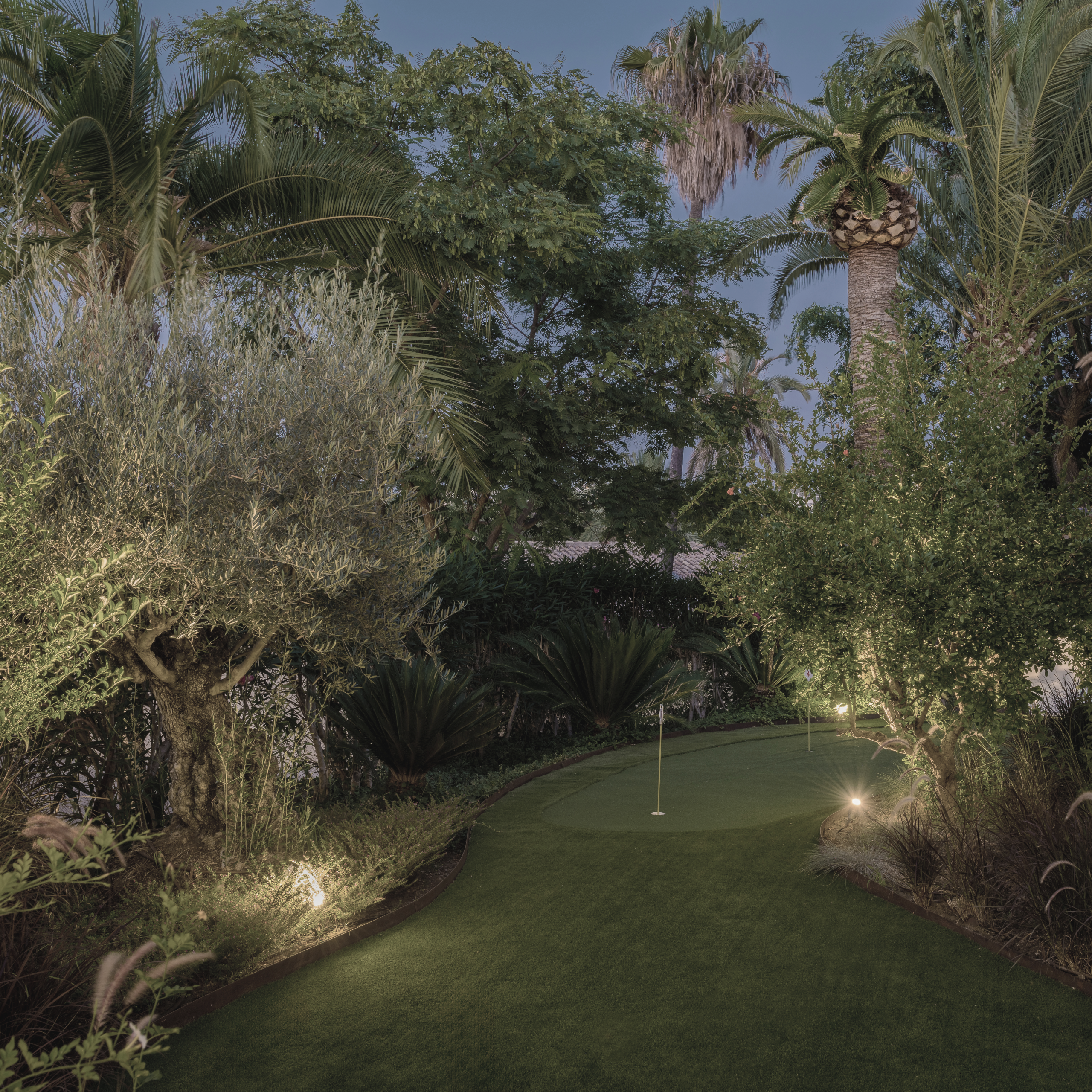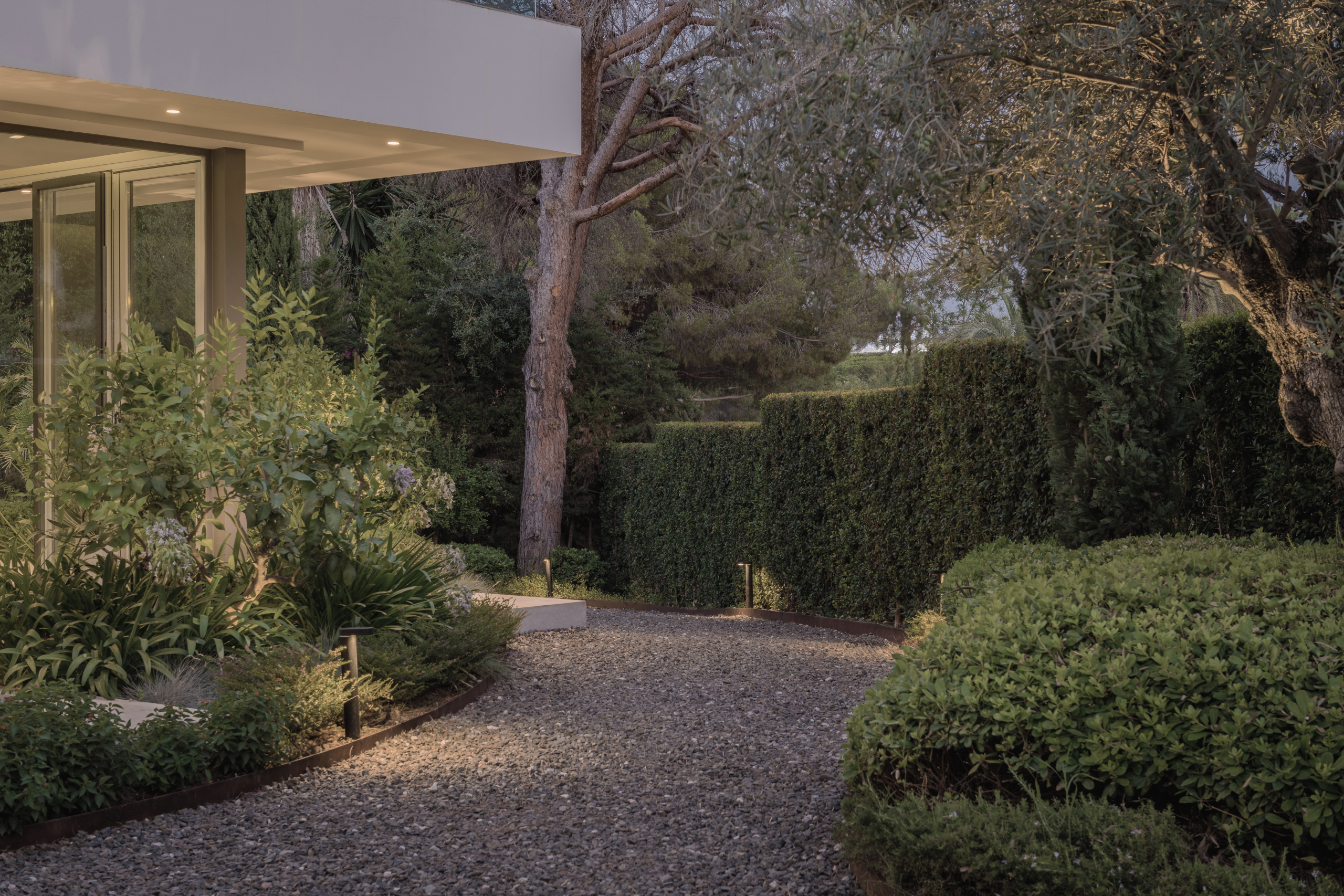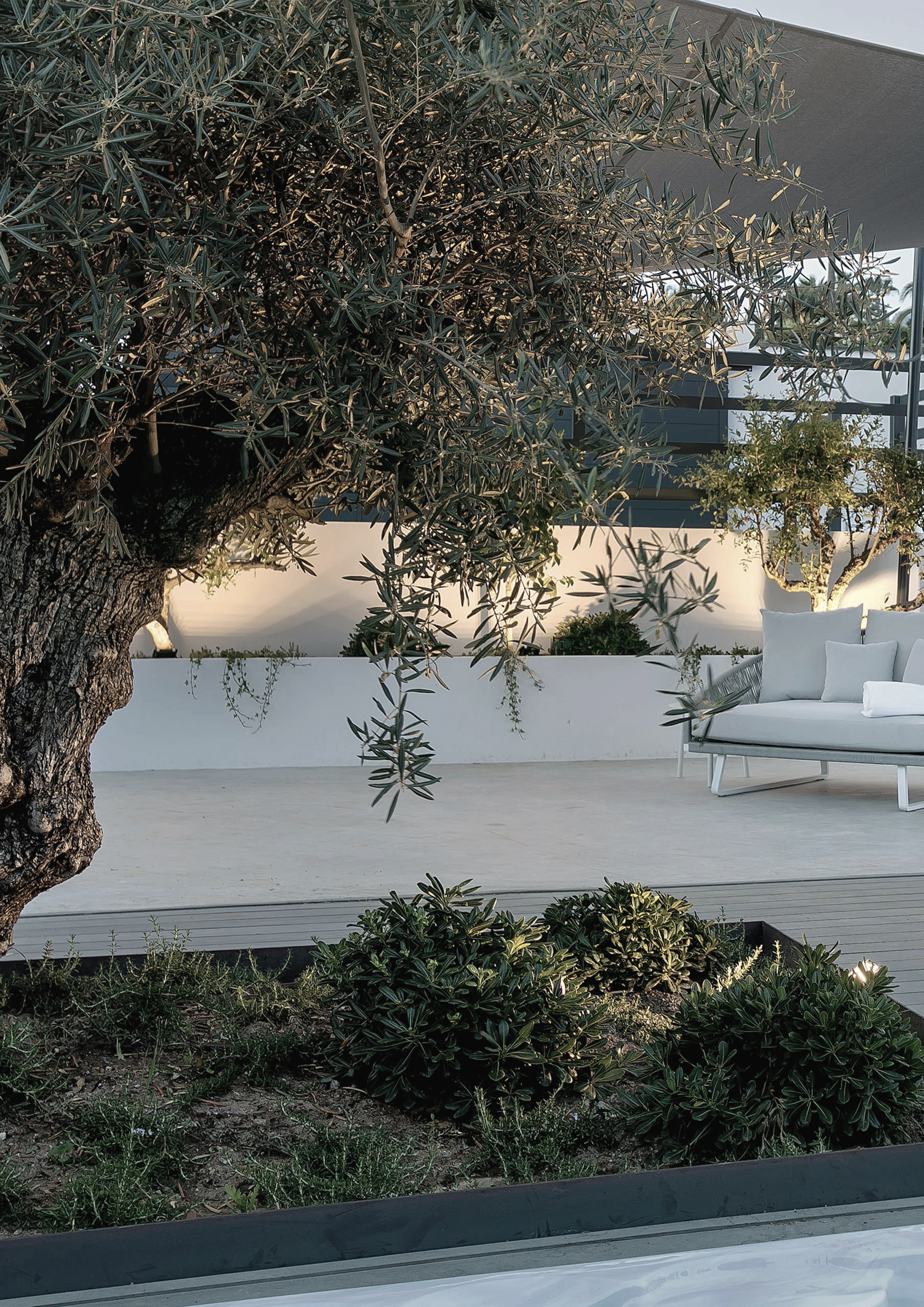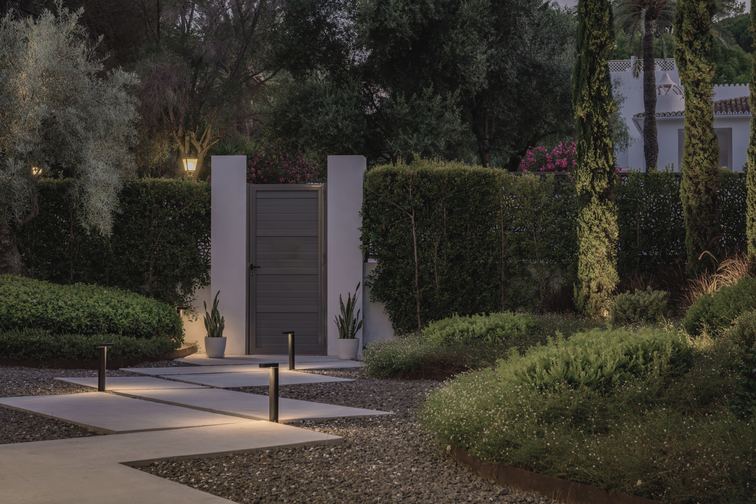 Como un pincel mojado en luz, vamos acentuando las texturas y los contornos del jardín, desde la impresionante silueta de un olivo hasta las delicadas curvas de una escultura. La iluminación ambiental, suave y cálida, invita a momentos de tranquilidad y reflexión, transformando los espacios exteriores en santuarios de luces y sombras.